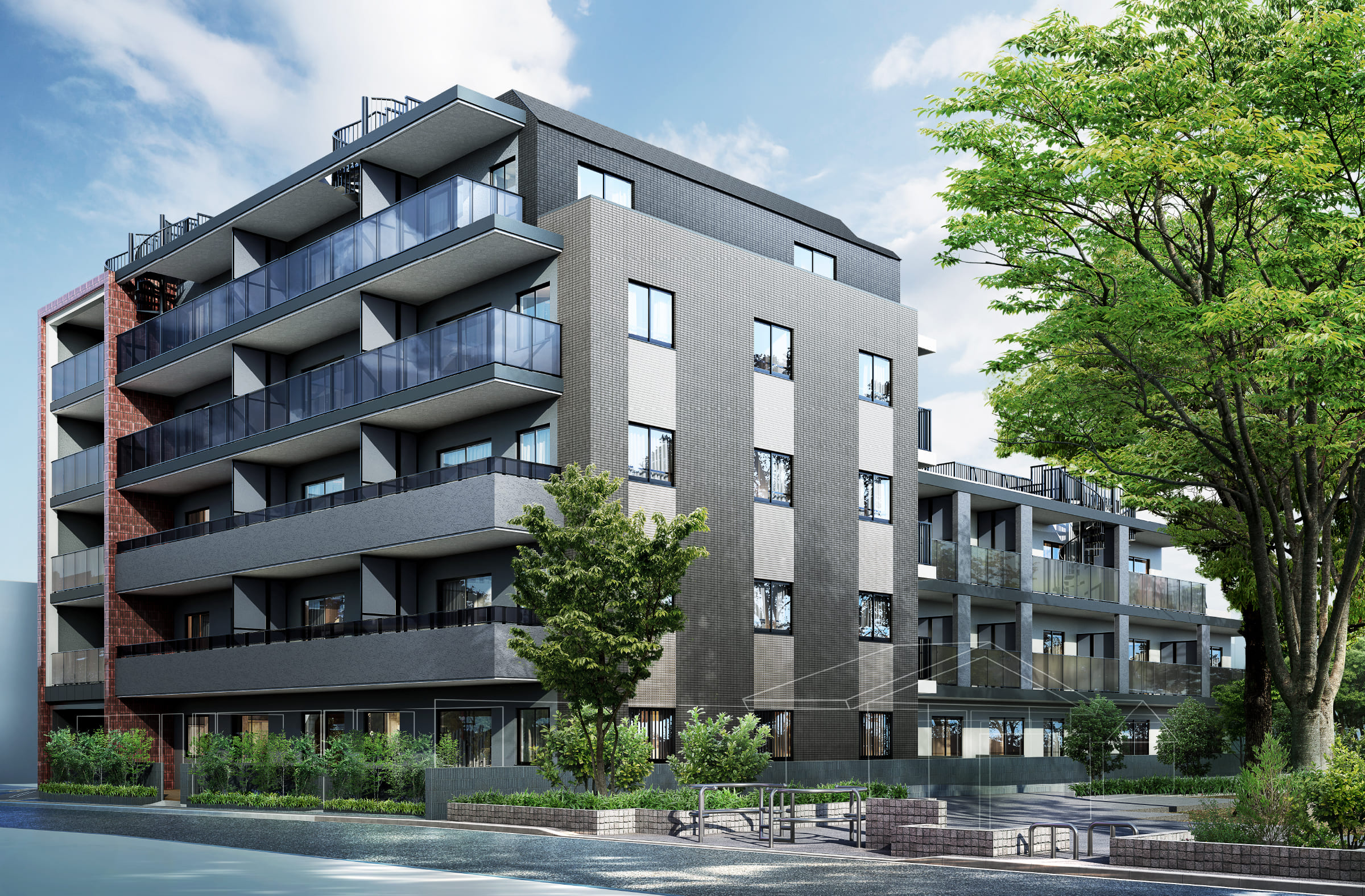 ※外観・エントランス完成予想CG/設計図を基に作成したものに環境写真(2025年6月撮影・一部CG加工)を合成しており色調等実際とは異なります。施工上等の理由により変更となる場合がございます。尚、外観形状の細部、設備機器等、再現していません。敷地内のみ表示しております。また、このCGで表現されている植栽は竣工から初期の生育期間を経た状態のものを想定して描いております。竣工時は植物の生育を見込んで必要な間隔をとって植えております。