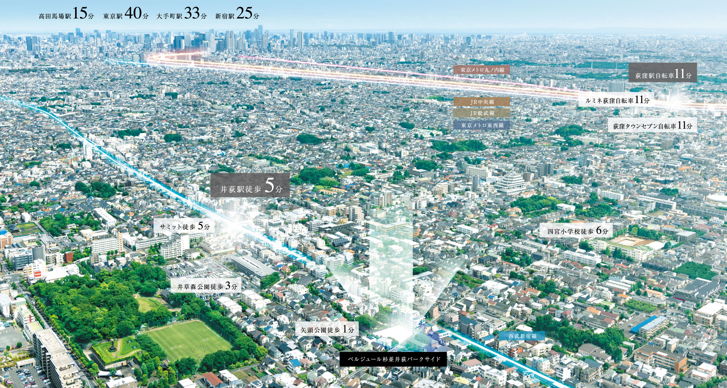 計画地は矢頭公園に隣接し、また近隣に広々とした井草森公園があり、